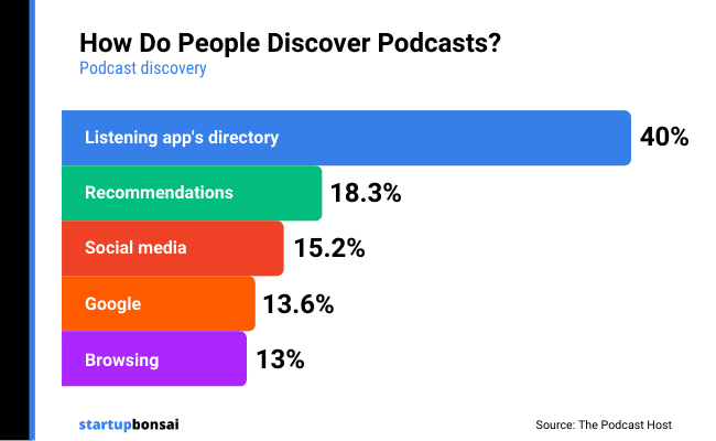 According to a survey from The Podcast Host, a combined 53.6% of podcast listeners find new shows via searching on the listening app's directory, or via Google. Another 18.3% of listeners discover new shows via recommendations from friends or colleagues.